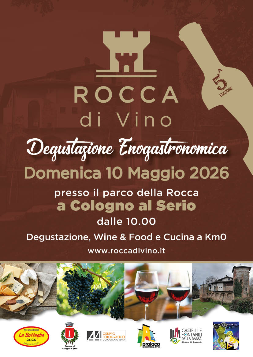 Dopo il successo della seconda edizione si riprensenta l'evento Rocca di Vino. Presso il Parco Rocca di Cologno al Serio, l’ associazione delle Botteghe, con il patrocinio del comune e con la partecipazione della ProLoco, propone la manifestazione enogastronomica Rocca di Vino, con l’obbiettivo di avvicinare la cittadinanza e i partecipanti a cantine vitivinicole e produttori agroalimentari del territorio. L’iniziativa si colloca nel contesto di valorizzazione delle aziende e dei prodotti locali a livello del Distretto del Commercio Castelli e Fontanili della Bassa Bergamasca dove sono allo studio varie iniziative, tra cui un mercato agricolo a km0.